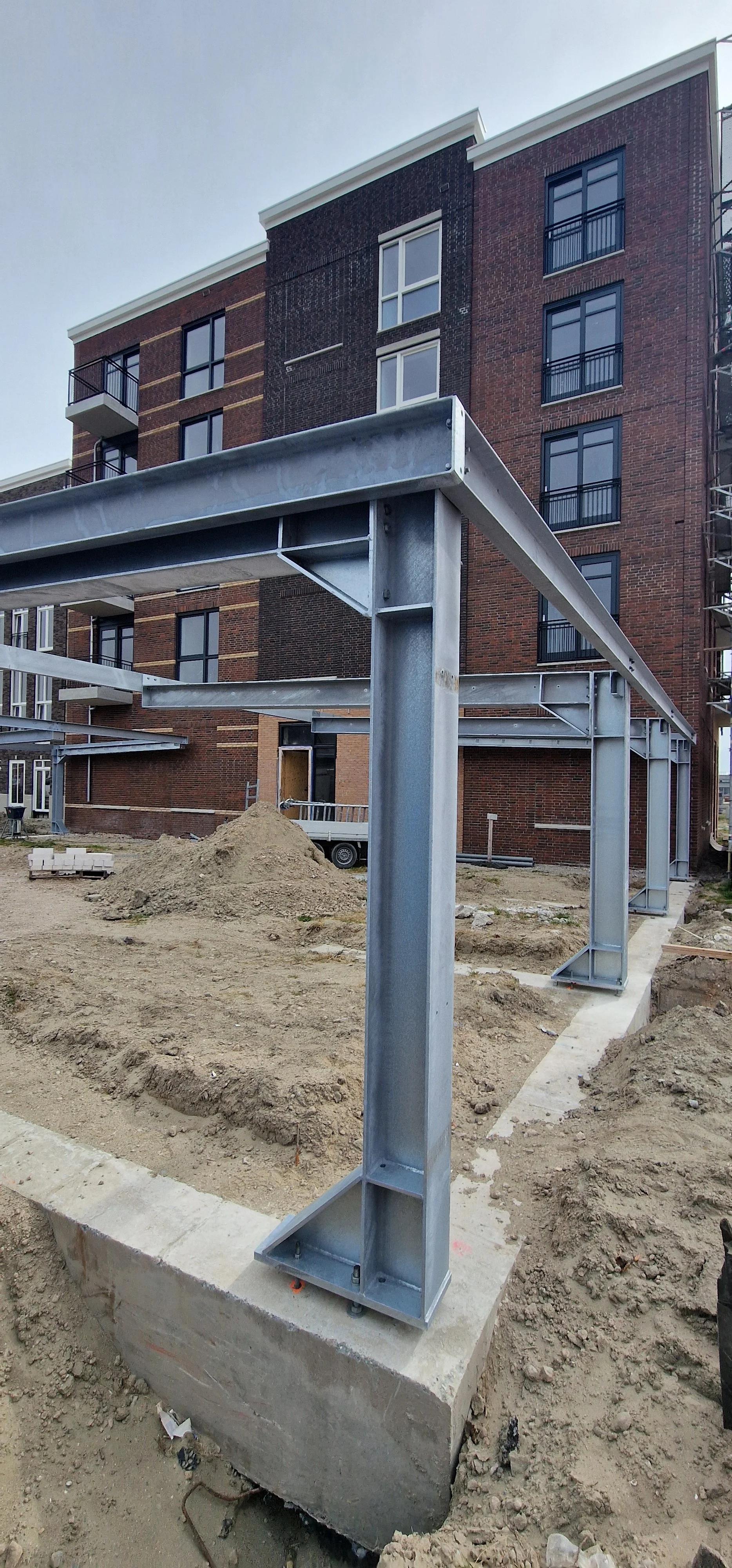 In de wijk het Scheldekwartier in Vlissingen hebben wij bij het project Koperslagerij een robuuste stalen luifelconstructie gemonteerd.